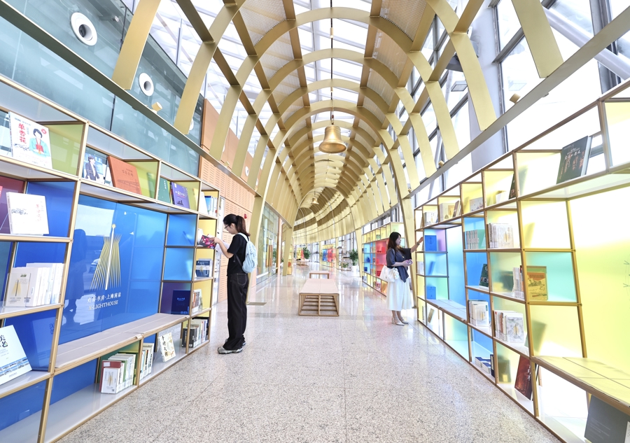 8月5日,上海南站2楼新增一座灯塔书房。南来北往的旅客可以在410米长的文化长廊上品味书香、休闲放松,在启程前享受宁静时光。