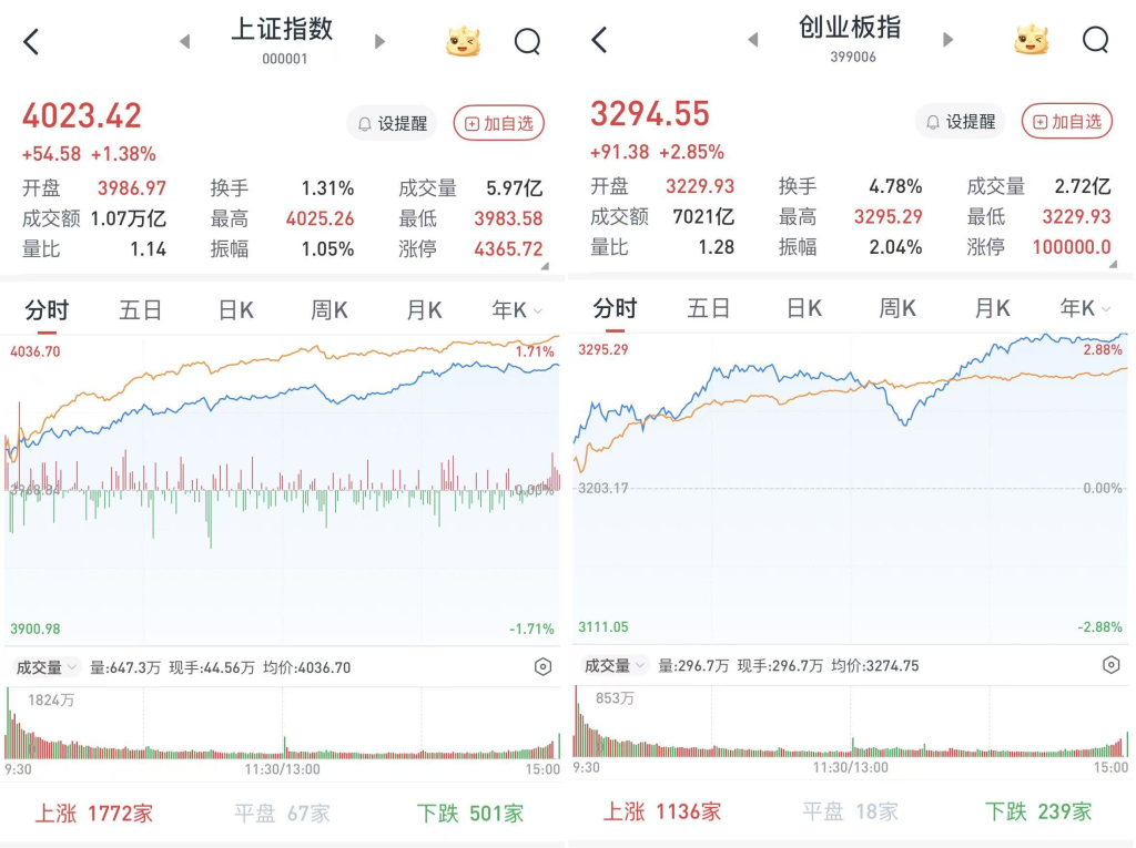 至收盘,上证综指涨1.38%,报4023.42点;科创50指数涨4.41%,报1403.41点;深证成指涨2.24%,报13828.63点;创业板指涨2.85%,报3294.55点。