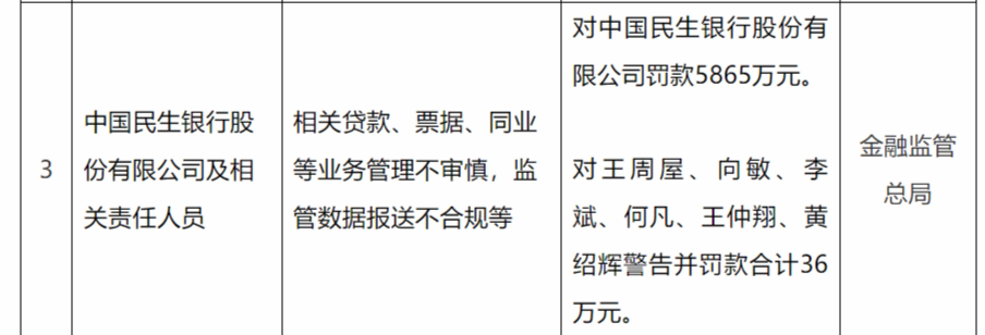 10月31日,国家金融监督管理总局行政处罚信息公示列表显示,中国民生银行股份有限公司,相关贷款、票据、同业等业务管理不审慎,监管数据报送不合规等,被罚款5865万元;责任人王周屋、向敏、李斌、何凡、王仲翔、黄绍辉被警告并罚款合计36万元。
